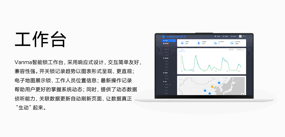 Vanma智能鎖工作臺,采用響應式設計,交互簡單友好,兼容性強。開關鎖記錄趨勢以圖表形式呈現,更直觀;電子地圖展示鎖、工作人員位置信息;最新操作記錄幫助用戶更好的掌握系統動態;同時,提供了動態數據偵聽能力,關聯數據更新自動刷新頁面,讓數據真正”生動“起來。