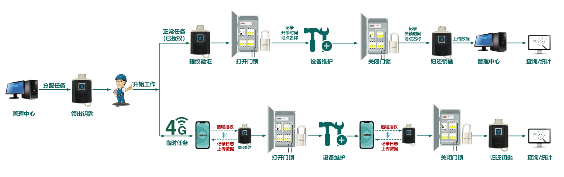 不同工作性質的作業人員需要對某區域開展工作時,提前通過管理員領出與本次工作范圍相應的智能電子鑰匙。工作結束后將智能鑰匙歸還給管理員,管理員將鎖內的數據傳輸到系統軟件中,并將智能電子鑰匙入庫。管理員通過系統軟件的數據分析,檢查作業人員工作中是否有按規定完成相關的運維檢查任務。通過智能鑰匙強制閉鎖越權操作。以“事前出入授權,事后追蹤記錄”的技術手段,讓電力系統的鎖具管理可視化,數據化,智能化。