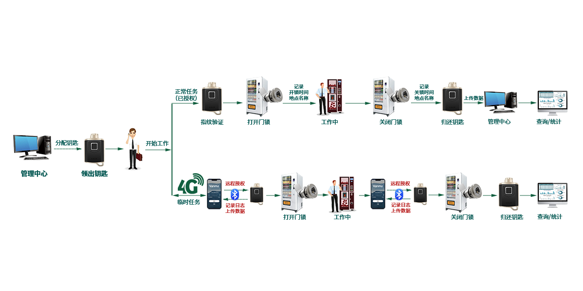 自動售貨機鎖控管理系統由智能無源電子鎖、智能指紋藍牙鑰匙、手機APP、主站管理軟件四部分組成。智能無源電子鎖完成機械動作及數據存儲;智能指紋藍牙鑰匙實現人員識別、給鎖供電及數據傳輸;手機APP與智能指紋藍牙鑰匙通訊,實現遠程授權操作及數據遠程上傳。